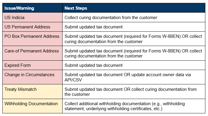 To the extent a Tax Document provided by an end customer is not acceptable, it is typically best practice to remediate the Tax Document, as soon as possible, before relying upon it for purposes of completing year-end reporting. It is also important to understand any withholding obligations that could arise due to the status of the customer’s tax documentation. You should contact your tax advisor for further information on your obligations to report and withhold.